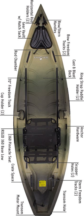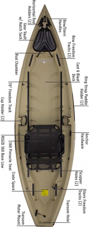 The Frontier is the ultimate hybrid kayak, designed from the hull up for serious anglers and hunters. Whether you are fly fishing in salt water, bass fishing in a river, or hunting in the marshes, the Frontier 12 will maximize your experience.