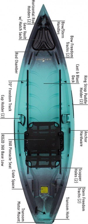The Frontier 12 is the most stable kayak . So don’t just stand, walk & fish with confidence on the 20″ wide Cast & Blast Deck. Face the action and easily access your gear with 360 degree mobility.
